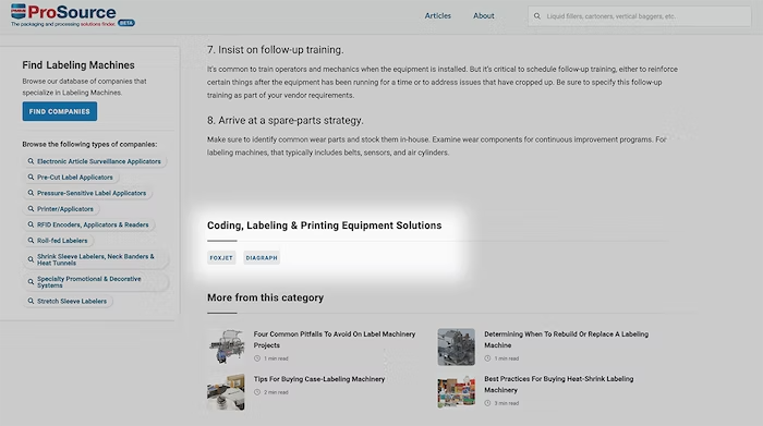 ProSource DirectoryPMMI’s directory categories have been completely revamped and updated for the new platform based on input from end-user experts in packaging. ProSource’s standardized categories makes it easier and less confusing to find machinery, materials, and supplies. Plain-language filters and graphic features help novice users who may not be well-versed in the packaging technology terms find what they need.